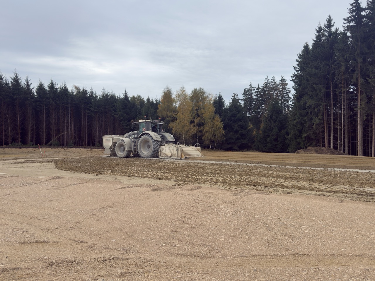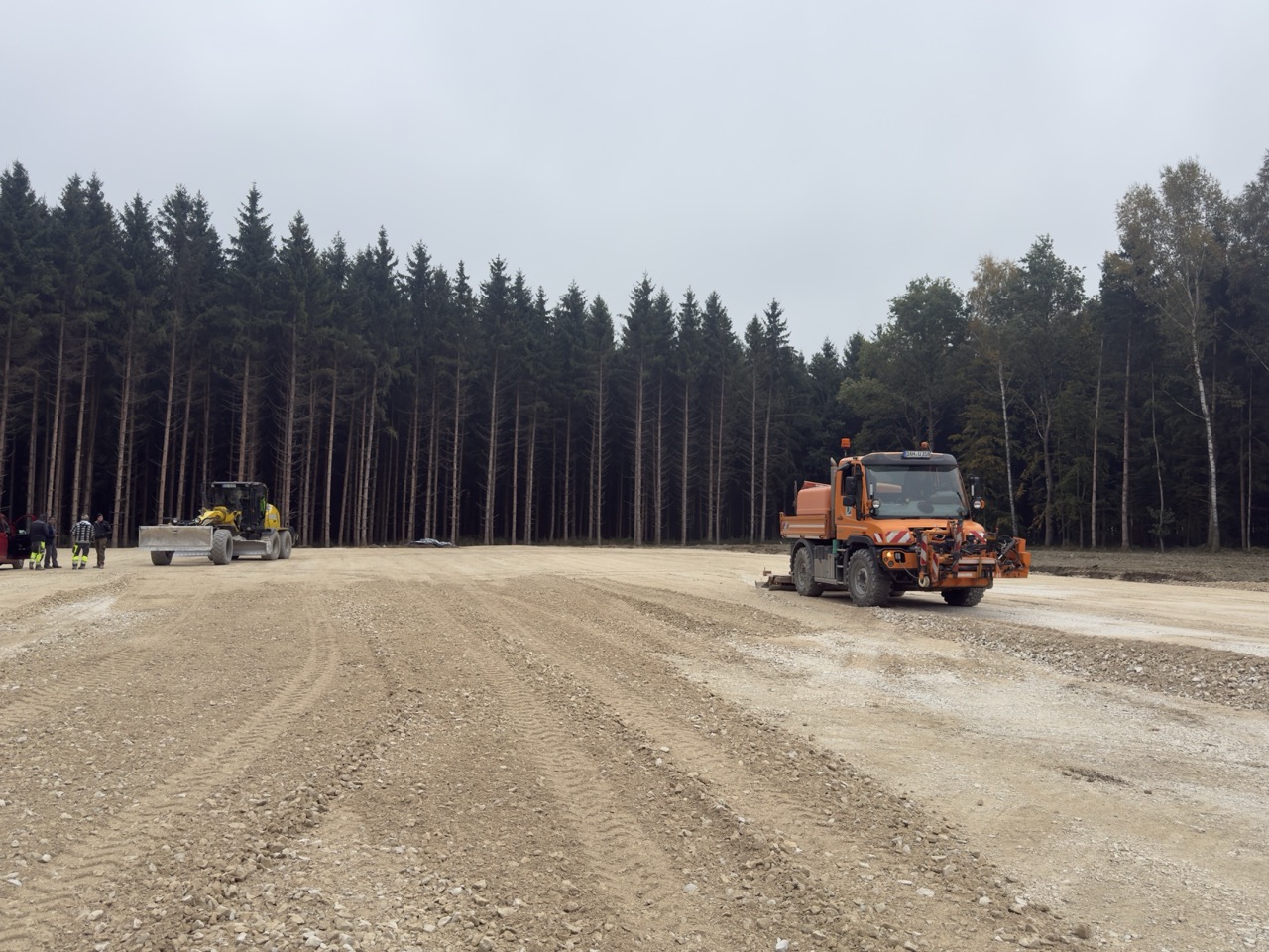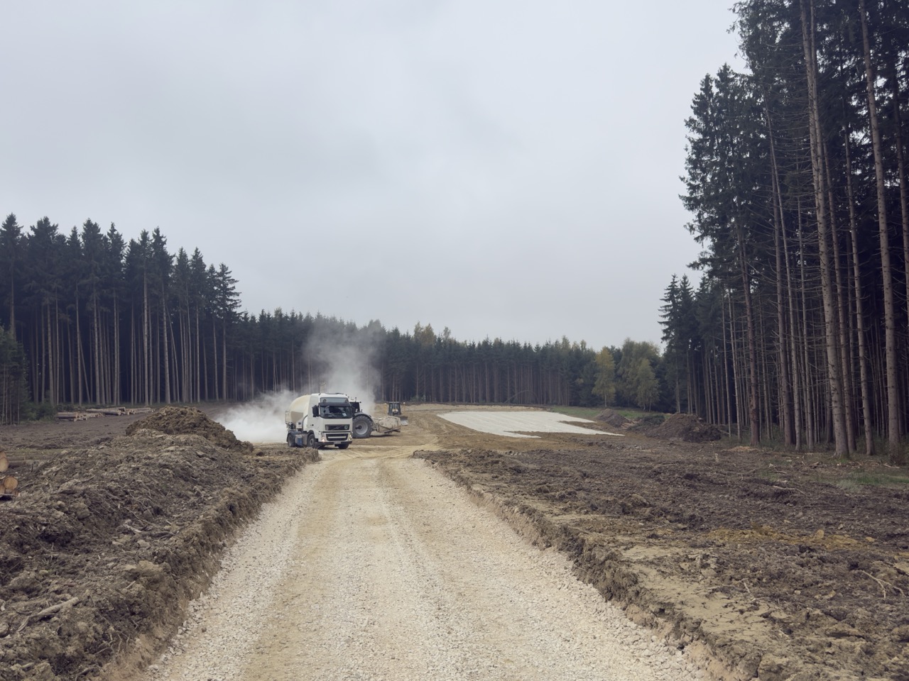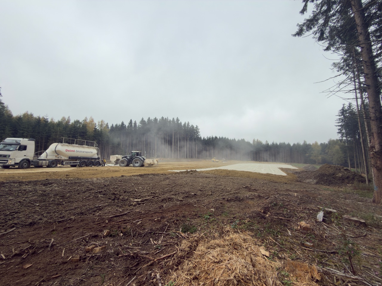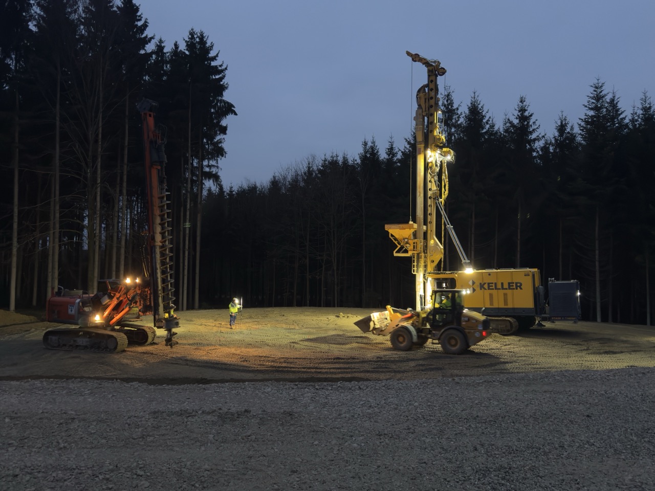 Neben der Zuwegung wurden die Kran- und Montageflächen fertiggestellt. Zur Bodenverbesserung im Fundamentbereich wurden rund 120 Kies-Rüttelstopfsäulen pro Standort eingesetzt. Bis Weihnachten wird die Tragschicht über den Säulen fertiggestellt werden, sodass Anfang März 26 planmäßig die Betonierarbeiten beginnen können.