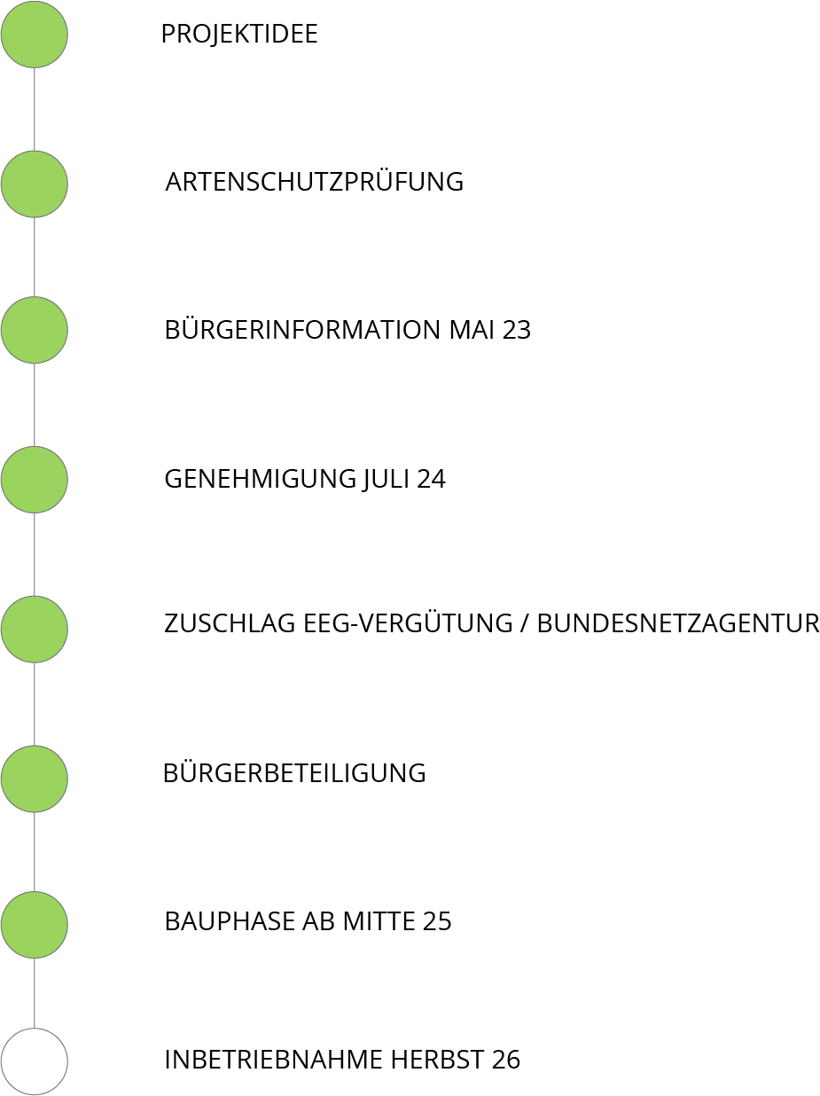 Bei der Ausschreibung der Bundesnetzagentur erhielt das Projekt Mitte September 24 den Zuschlag für die Stromvergütung nach EEG für die nächsten 20 Jahre. Der nächste Meilenstein im Projekt: Bürgerinnen und Bürger hatten ab Mitte Oktober 24 die Möglichkeit, in Form eines Nachrangdarlehens in das Projekt zu investieren und somit die Energiewende aktiv voranzutreiben. Im Februar 25 war die Bürgerbeteiligung komplett, nachdem insgesamt rund 3,0 Mio.  EUR eingeworben werden konnten.